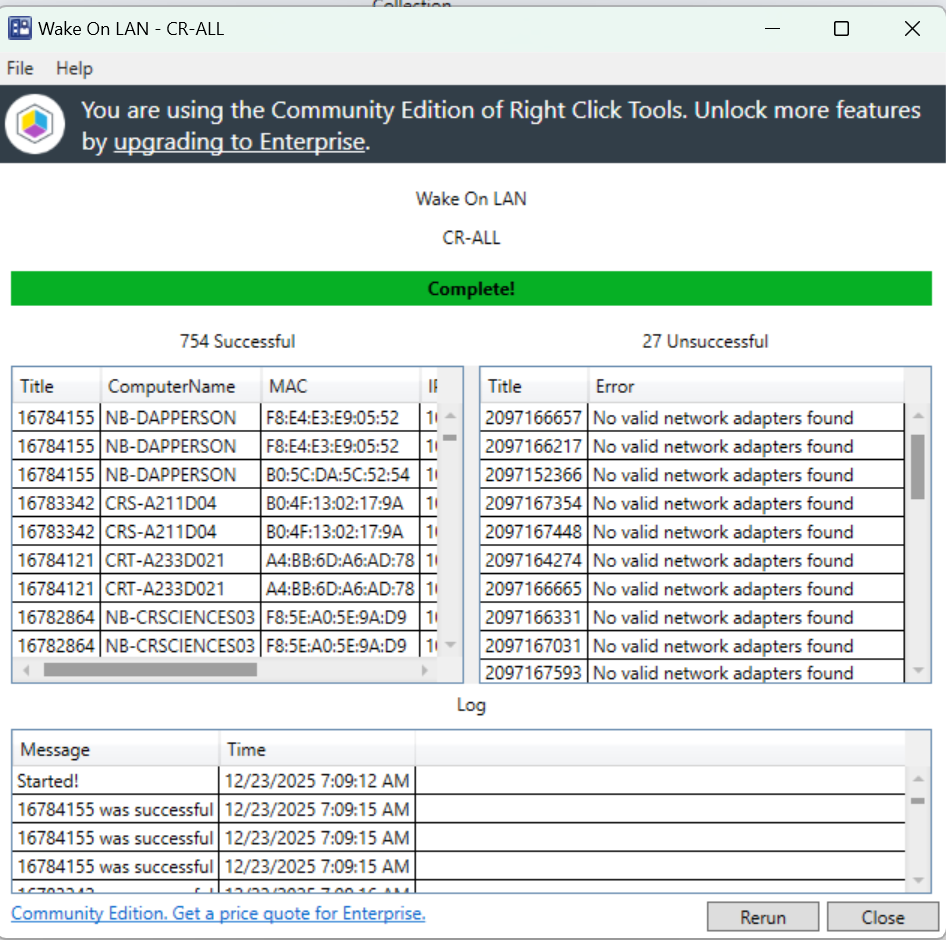 I realize that the community edition doesn’t receive support but maybe you will take a suggestion. When we do WOL it would be great if the list of ‘Unsuccessful’ computers listed them by name. The Successful column lists the names of the computers so why not the Unsuccessful.